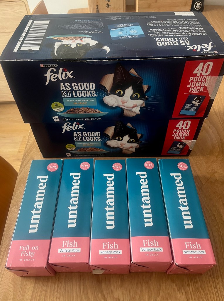 Donation of 80 Felix As Good As It Looks Ocean Selection cat food pouches and 25 x cans of Untamed Fish Variety Pack in Jelly.